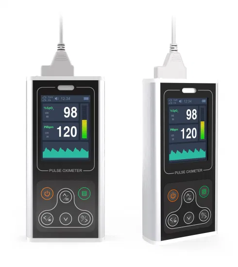- The device features a comprehensive display that shows SpO2 values, pulse rate, and waveform, along with a bilingual interface and multiple functional options.