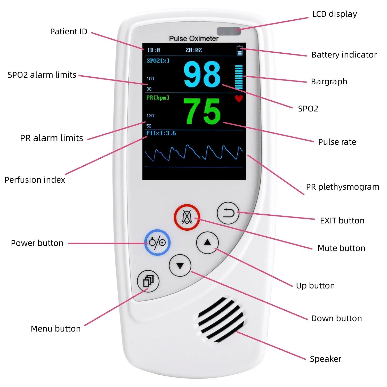 2.8″ color LCD prominently displays SpO2 and pulse rate readings