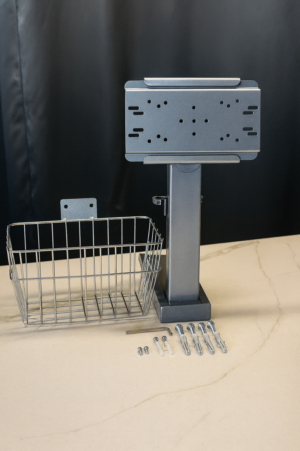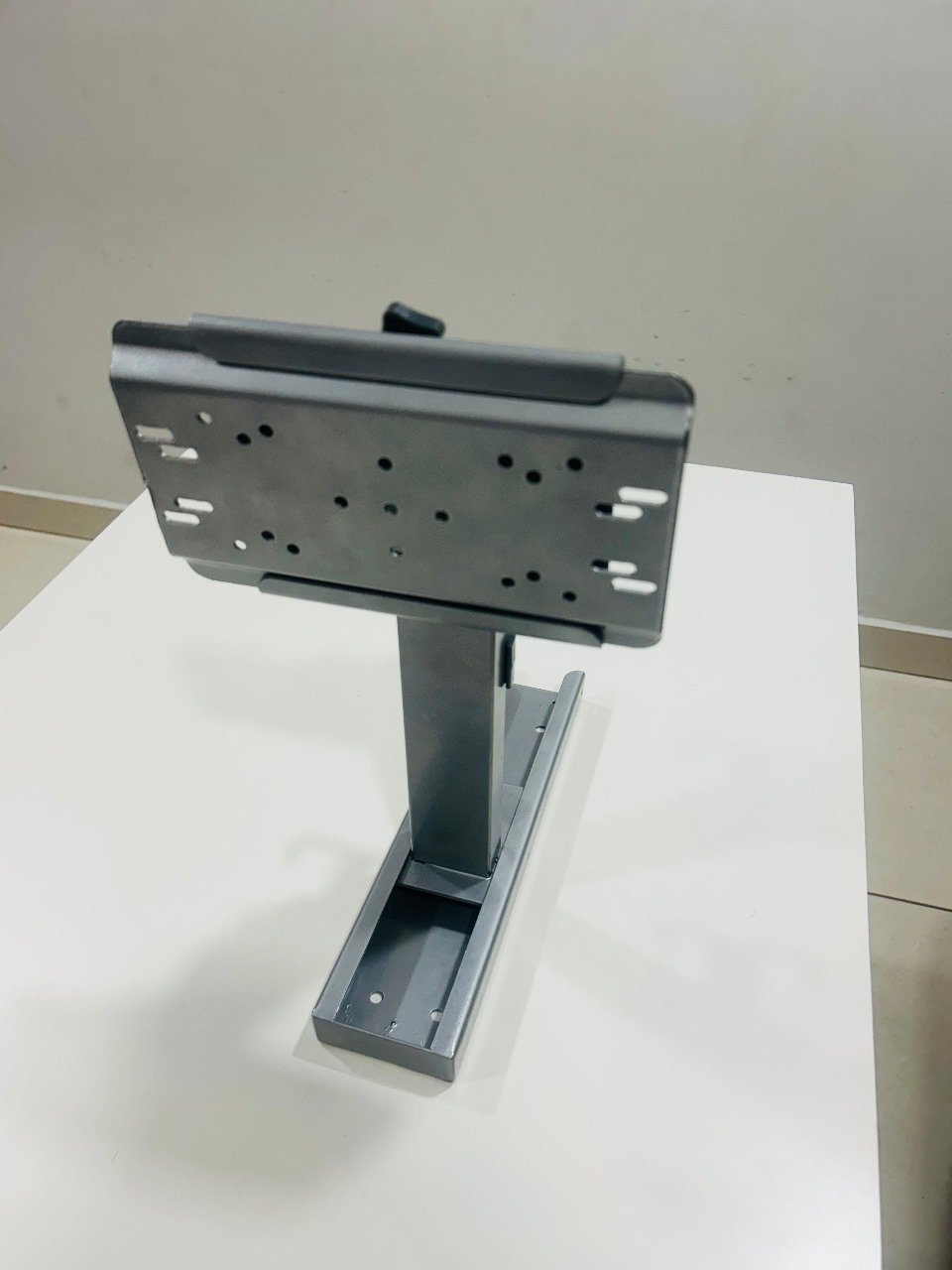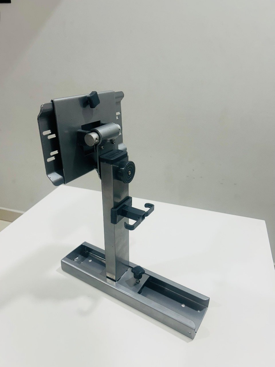 It is a permanently fixed model. In addition, the monitor fixing area can be tilted up and down or rotated left and right. Hooks are present to hold the cables of the monitor. Also, provided with a basket for holding the accessories of the monitor.