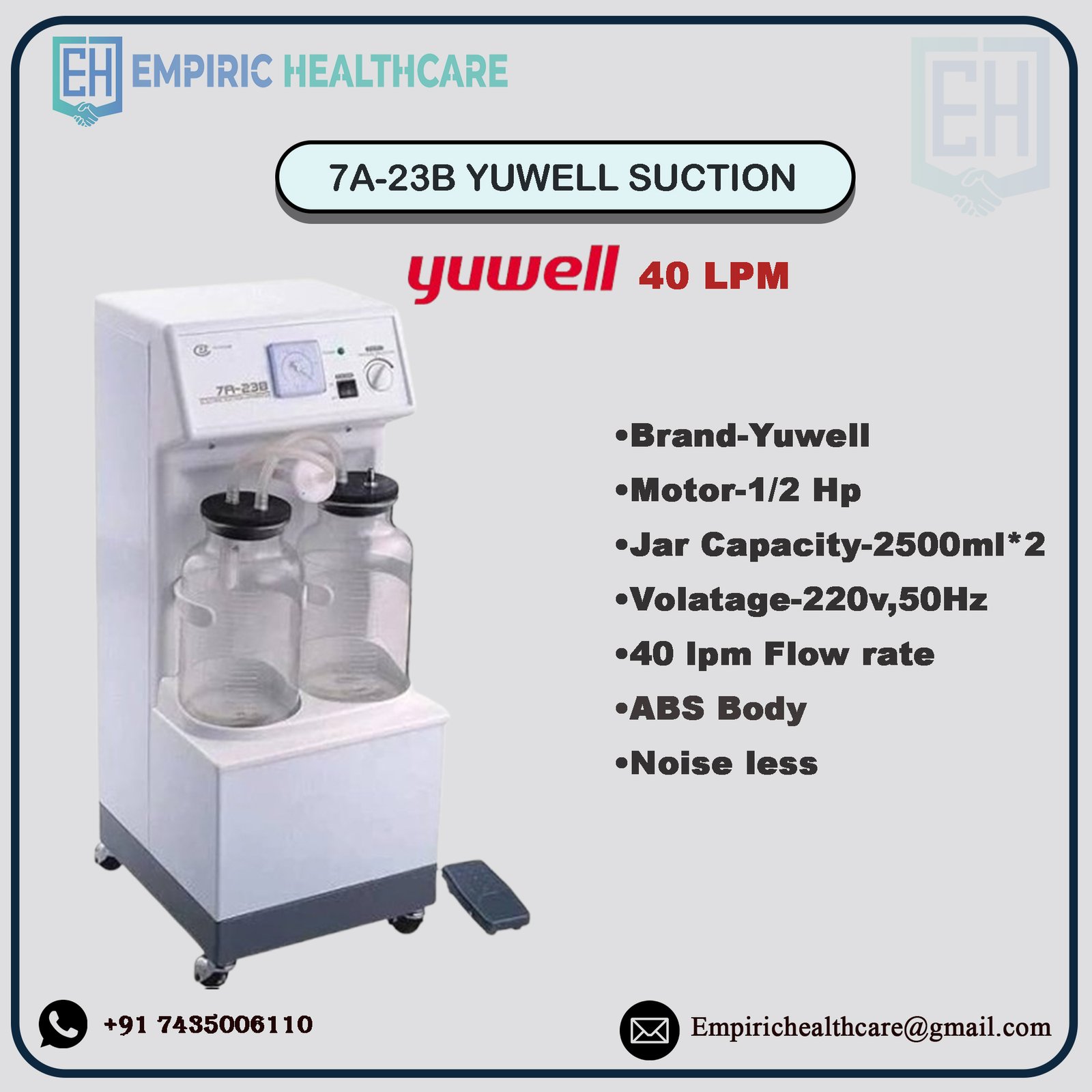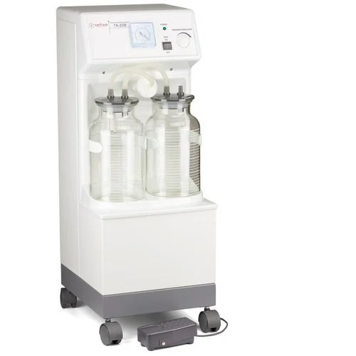 A high-capacity, high-power suction machine for general surgical use. The 7A-23B (High-Power) features an oil-free, maintenance-free suction pump with 40 LPM capacity. Maximum negative pressure can be conveniently controlled from the regulator on the front panel. The durable, aesthetically designed body features a storage compartment at the back and is made from powder-coated metal and plastic. It comes with 2 glass jars, a foot-switch, a tubing kit and spare bacterial filters.
